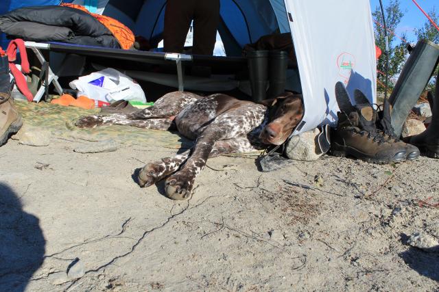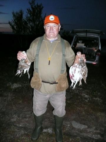 Охотились в районе Серебрянки. Закидывались в сопки подальше на моторе, проверяли соседние с лагерем сопки. Птичка была. Охота на белую куропатку сама по себе интересна и азартна. Стоит найти выводок и работа начиналась по принципу - Кто, кого? Из выводка в 5-7 птиц брали не больше двух голов. Особенно мне нравится охотить одиночного куропача. Хитрый как лис! Собака стоит, при моём подходе, с громовым хлопаньем крыльями и дикими воплями куропач на взлете сразу делает вираж и скрывается за кустом, выстрелить не успел, раззява... Заметив примерно где снижалась птица идём туда с пёсой. Собака прихватив запах вдруг переходит на следовую работу и быстро, без остановок повторяет путь побега куропача. Пройдя метров 30 со следовой работой Джой приостанавливается и метрах в 10-и, за кустом взлетает куропач! Опять не подпустил.... Этого хитрого куропача мы перемещали 4-е раза. В результате такой охоты ни кто из участвующих в этом действии не пострадал. И я думаю, что все участники остались довольны этим своеобразным поединком, а , то что в этот раз куропач оказался хитрее и везение было на его стороне, так на то она и охота! Конечно может курцхаар и выразил бы мне претензии за нерасторопность…, но в силу своей воспитанности он промолчал....