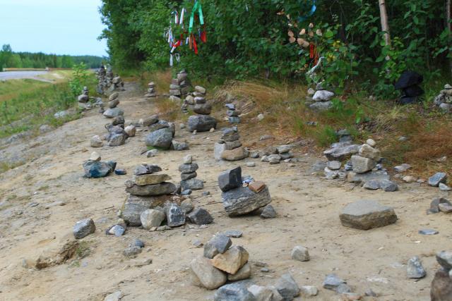 Ритуальное, уходящее своими корнями в далёкое язычество жертвоприношение коренных жителей заполярной тундры - лопарей (саамов)подвязывание цветных тесёмок и складывание каменных столбиков - пересекающие Полярный круг тоже воздают дань традициям.