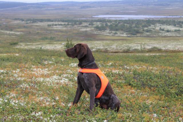 На первой же параллели, пройдя метров 40 Джой замедляет ход и развернувшись на ветер стаёт. Подбегаю к собаке и метров с трёх командую: - \"Вперёд!\". Собака продвигается вперёд около метра и прямо по носу взлетает одиночная куропатка, перестраховываясь дал команду \"Даун\", пёс на месте. Ну, что ж начало есть. Снова пускаю собаку в поиск. Пёс методично обыскивает местность, видно, что он серьёзно и увлечённо работает и знает, что и где искать. И, что самое интересное - Джой упорно больше забирает влево, к мочажинам, пару раз развернув его свистком, отправляю на всякий случай проверить саму сопку, что бы не оставалось не обысканных мест. Минут через 10 Джой на параллели спустившись в низину целенаправленно пошёл дальше в болотистый кочкарник. Наблюдаю. Потяжка несколько метров – стойка. Бегу к собаке точно зная, что там птица…., стоит твёрдо, уверенно. Команда – вперёд!